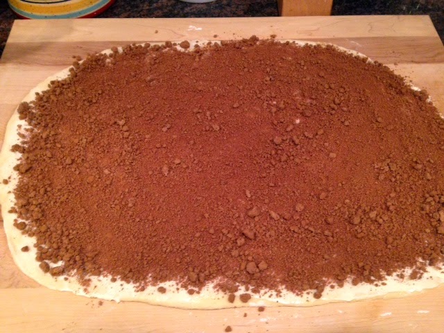Roll dough out to a 16 X 21 inch rectangle. Smear dough with butter and sprinkle sugar/cinnamon mixture evenly over buttered dough.